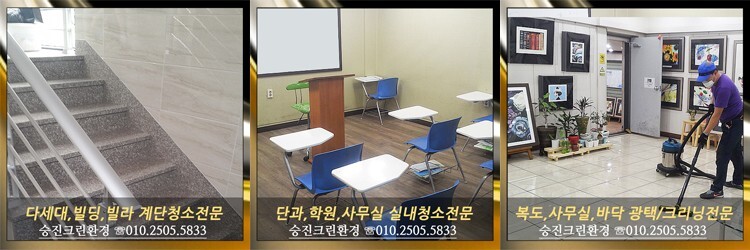 *반갑습니다. 건물청소전문업체-승진크린환경입니다. 회사의 이미지를 대표하는 건물내부/계단 첫 느낌부터가 달라집니다. 많은 사람들이 이용하는 계단 / 건물내부공간은 각종 오염으로 부터 쉽게 노출되어 수시로 청소를 하지 않으면 쉽게 때를 타기 마련입니다. 「 빌딩청소용역 , 빌라계단청소 건물청소관리 」 각종 오염물이나 쓰레기및 먼지,황사,꽃가루등 입주자 스스로 관리하기 힘든 계단 공용공간은 전문업체의 특별관리가 필요합니다. 최신의 계단 바닥 및 내장제의 특성을 고려한 전문건물관리의약품을 이용하여 효과적인 크리닝을 제공합니다. 꼼꼼히 하나하나 놓치지 않고 내가 생활한다 생각하며 주인의식을 갖고 늘 청소작업을 진행합니다. 전문장비보단 다소 힘들지만 손으로 하나하나 때를 지워가며 원래대로의 모습을 되찾기위해 많은..